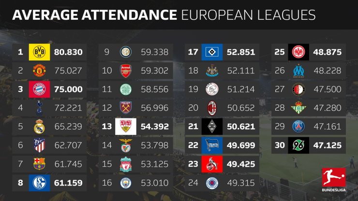 Attendance – The Bundesliga has the highest average attendance for any league in the world; over 40,000 per game for over 10 years. This is because the fans feel more connected to the club when they can influence its decisions. Arguably the second largest club in the Bundesliga, Borsussia Dortmund is a club owned completely by its members. It has also had the highest average attendance in the league for over 20 years, hovering near 80,000 spectators per game. A more fan integrating model has helped keep ticket prices lower than its European counterparts. The Bundesliga is the only league to still have standing stands in Europe, where a ticket costs around €10, far cheaper than the £30 ‘cheap seats’ at Old Trafford.