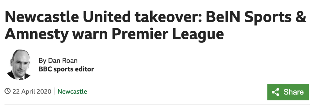 BeIN have the exclusive rights to screen Premier League matches in the Middle East. They are a Qatar-based company which holds the rights to Premier League football in the Middle East and north Africa, in 2017 until it ceased broadcasting in August 2019. Pirate broadcaster beoutQ, which operates in Saudi Arabia, was illegally streaming content licensed to beIN SPORTS. Arabsat, a satellite network owned by the Saudi state, has denied having any connection or involvement to beoutQ, but the Premier League was highly critical of what it sees as a lack of action from the Saudi government to clamp down on the piracy. The Premier League wrote: ‘Despite repeated complaints by beIN and other rights holders, Saudi Arabia has never brought criminal action against beoutQ, or its Saudi facilitators’. BeIN have objected to the Newcastle United takeover. This could potentially also block the Newcastle United takeover under Rule F.1.6 if the board believe there had been intellectual property breaches.