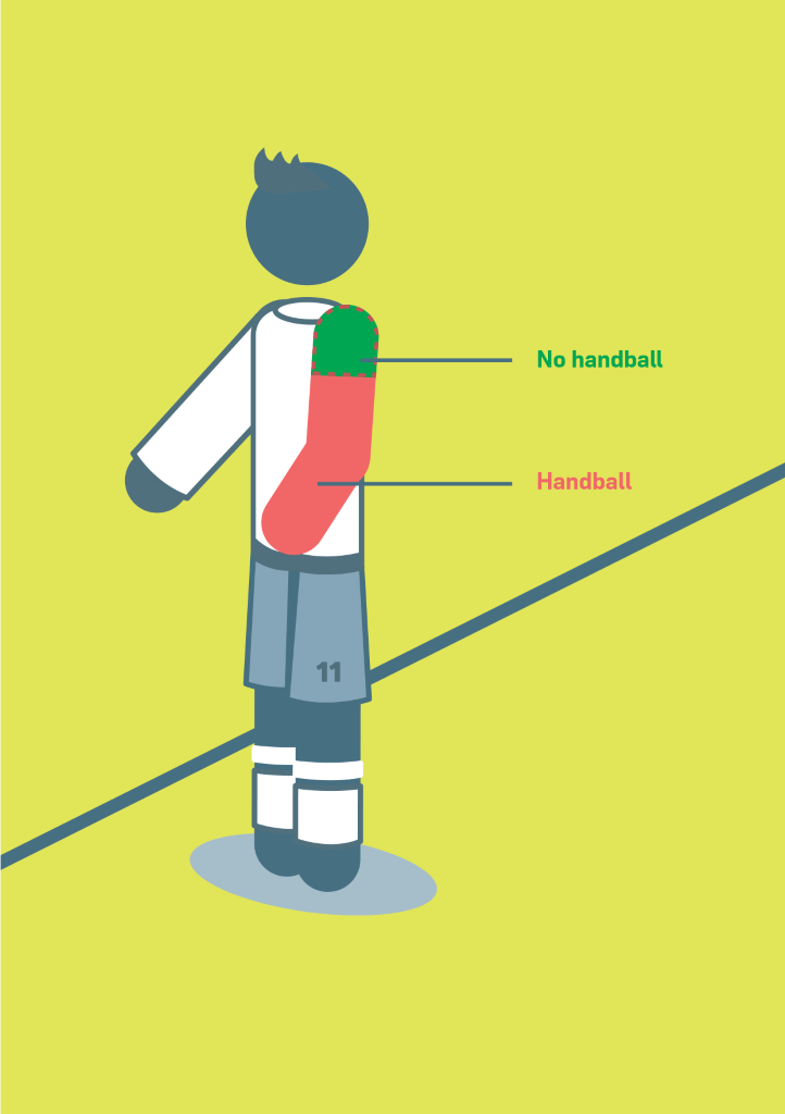 First, the basics. The upper boundary of the arm is in line with the bottom of the armpit, for the purposes of determining handball offences. Therefore, contact below this imaginary line at the base of the armpit will be deemed to be handball. Contact above this line will not constitute a handball offence. This is illustrated below.