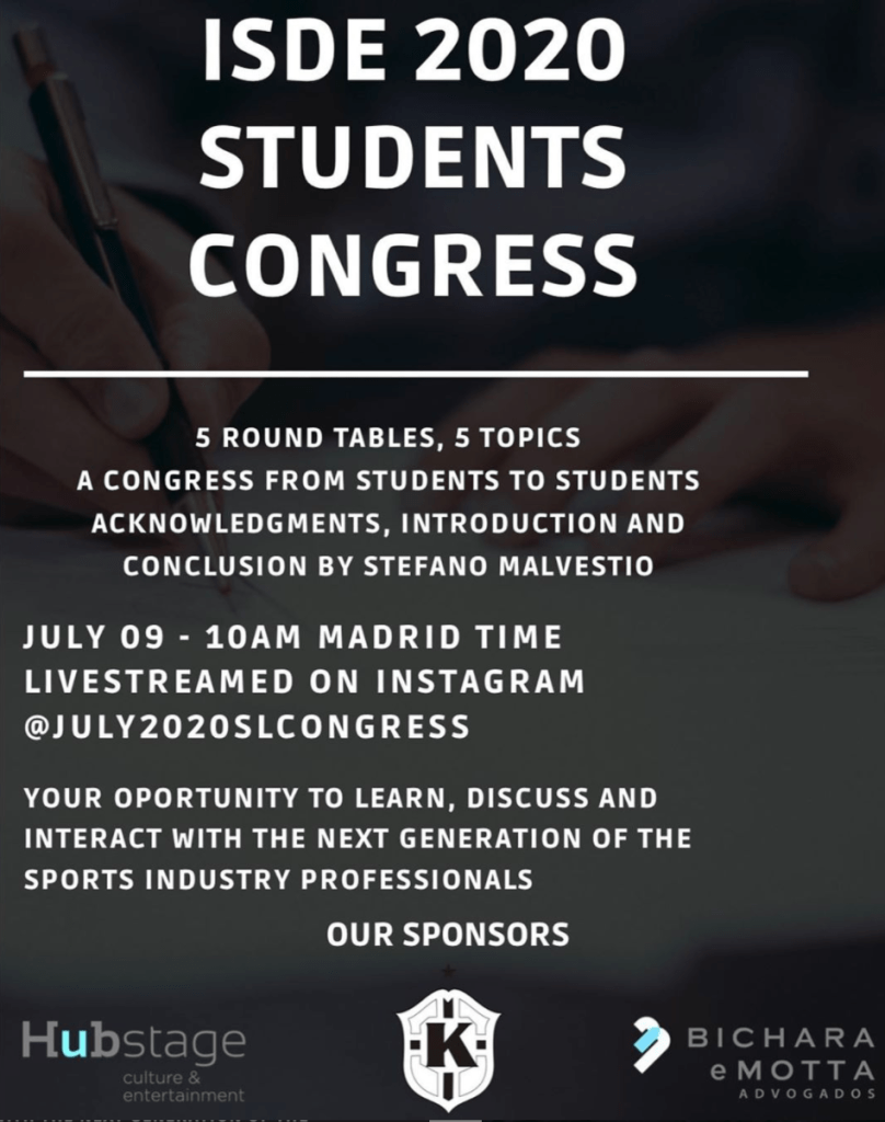 The ISDE 2020 Students Congress is being created an run by the International Sports Law class of 2020 with guidance from Stefano Malvestio from Bichara e Motta Advogados. All the speakers and moderators are current students of the programme.